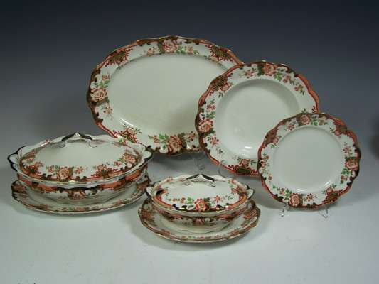 comprising: four graduated meat dishes; twelve soup and desert bowls; five vegetable tureens and stands; eleven plates and side plates; twelve desert plates; with printed marks (qty)