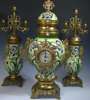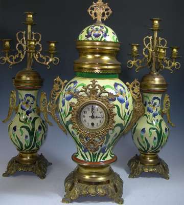 the dial with arabic numerals surrounded by gilt metal frame, the pottery body painted with purple irises on a light yellow ground, with two pierced gilt metal handles and similar finial (3)