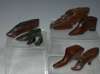 comprising: a large carved example; a smaller example with carved details including buckle and tulip design; another carved and poker work decorated example with swivel lid; two plainer examples with slide off covers; one with no decoration; the other with stud work inlay; together with a white metal example; and a pair of small shoes (probably dolls shoes) (8)