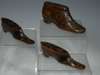 profusely decorated with inlaid brass floral and foliate designs with anchor motifs and coat of arms, the swivel lid opening to reveal two compartments; together with a pair of continental shoe snuff boxes with wire work and stud inlay in floral designs, with hinged lids (3)