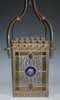 of square section, each side with stained and leaded glass panels, with pierced and embossed brass surmounts supported by four curved uprights, linked by a central rod