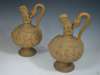 each with unglazed body and raised decoration of beast's head and foliate scrolls with serpent handle on knopped stem and spreading foot rim, impressed Schutz monogram marks (2)