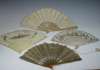 comprising: one with painted classical scene and ivory guards and bones; a lace work example with mother of pearl guards and bones; a silk work and sequin example with amber coloured pierced guards and bones; together with a floral painted wooden example (4)