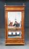 the projected moulded cornice topped by finials over a quarter veneered frieze panel flanked by carved flower heads, mirrored door flanked by tapering fluted columns, a long drawer, moulded base on tapering bun feet