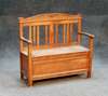 the shaped and fretted top-rail over vertical splats with tulip marquetry over box seat with moulded frieze on block feet