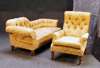 comprising: two button back arm chairs on squat baluster turned legs; and a button back sofa on squat tapering ring turned legs, 192cm wide (3)