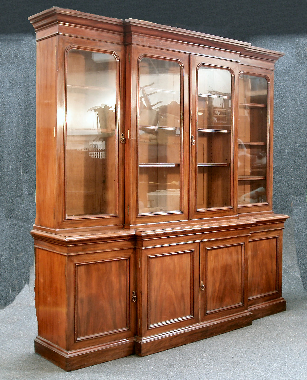 the projected moulded cornice over four glazed doors enclosing adjustable shelves, on moulded stepped lower base with four panelled cupboard doors, raised on plinth base