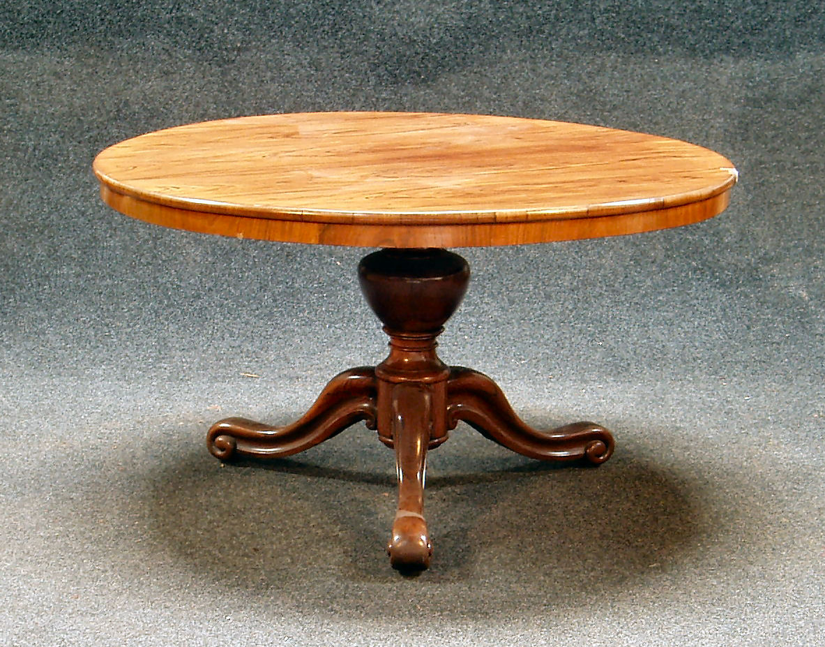 the circular top on vase turned support terminating in a finial, downswept tripod legs terminating in C scrolls, on castors