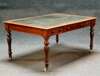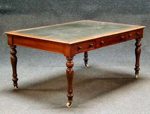 the moulded rectangular top with skiver, over three frieze drawers, and opposing drawers, on baluster turned legs, ceramic castors