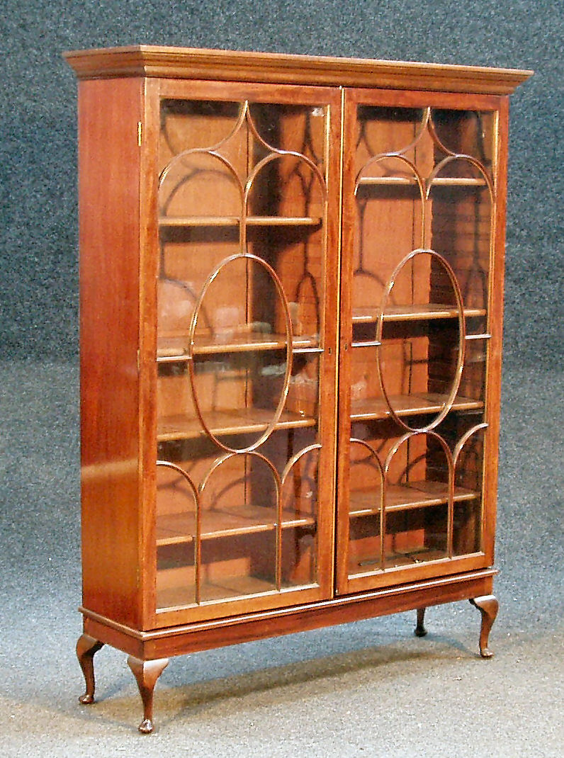 the later moulded projected cornice over two astragal glazed doors enclosing adjustable shelves, formaly two sections of a larger book case, on later squat cabriole legs; matching previous lot