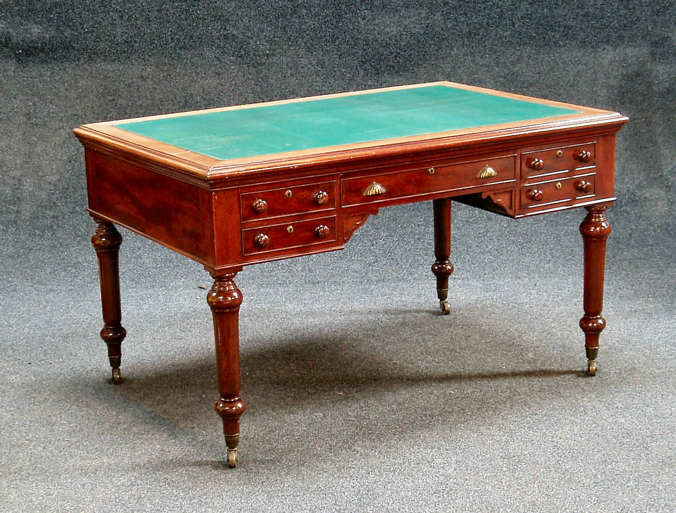 the moulded rectangular top with embossed leather skiver over long knee-hole frieze drawer flanked by banks of two short drawers on turned legs with brass caps and castors.