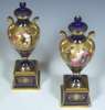 each with urn shaped body on a stepped square base, and twin gilt scroll handles, with painted classical scenes and profuse gilt detail, on a cobalt blue ground