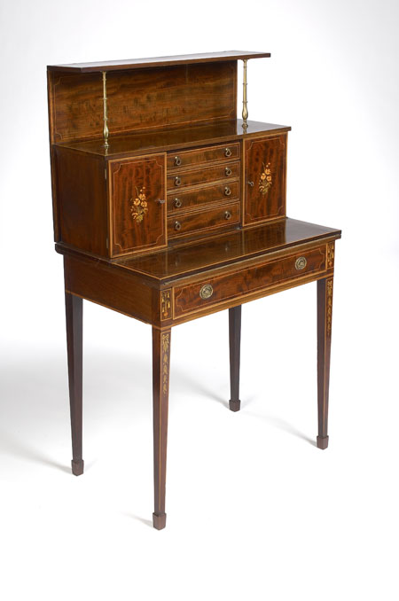 in the Sheraton manner, the shelved superstructure on gilt brass baluster supports above a bank of four shallow graduated drawers flanked by cupboard doors inlaid with foliate sprays, the fold out top enclosing a baize inset bordered by a broad satinwood crossbanding above a full width frieze drawer with pierced brass oval ring handles, on square tapering legs decorated with ribbon tied husks and headed by flower filled urns, on spade feet, the whole enhanced with boxwood lines
