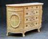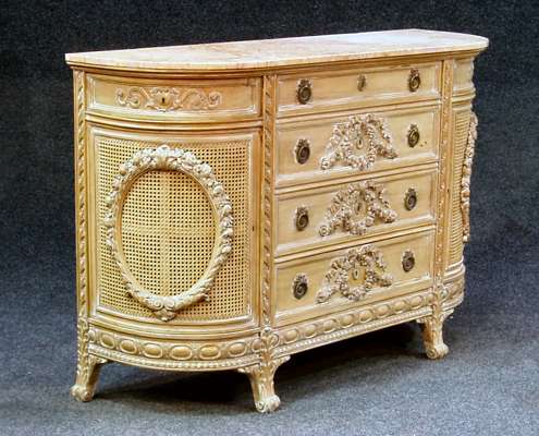 with four floral and swag carved graduated long drawers flanked by a short drawer over caned cupboards with a oval foliate carved frame, on acanthus carved legs