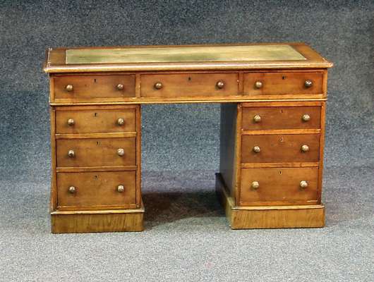 the moulded rectangular top with skiver, over three frieze drawers raised on two banks of three short drawers