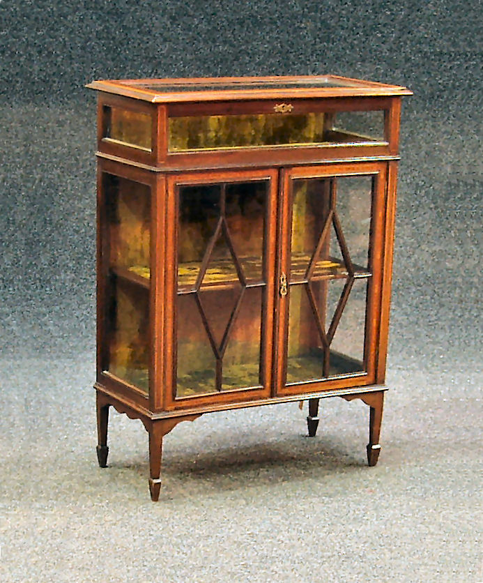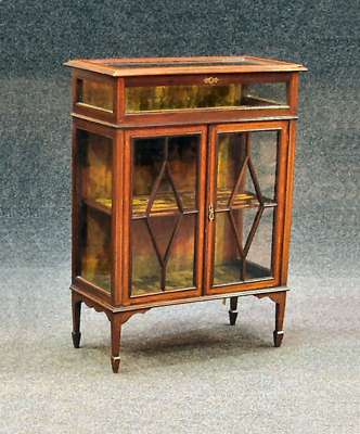 the moulded rectangular glazed top over a frieze glass panel, astragal glazed doors enclosing shelves on square tapering legs, with spade feet