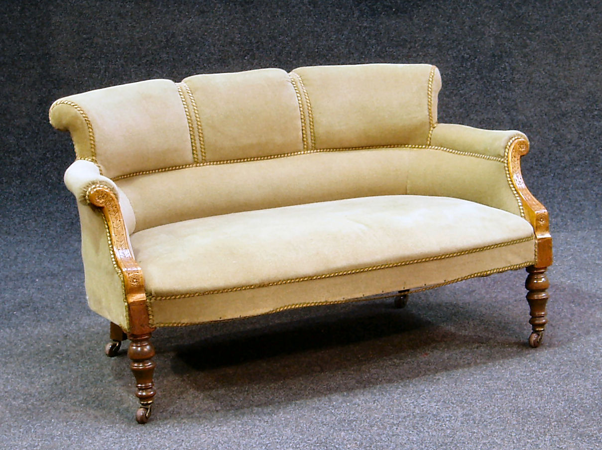 with carved outstretched arms raised on squat baluster turned legs, ceramic castors