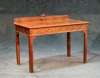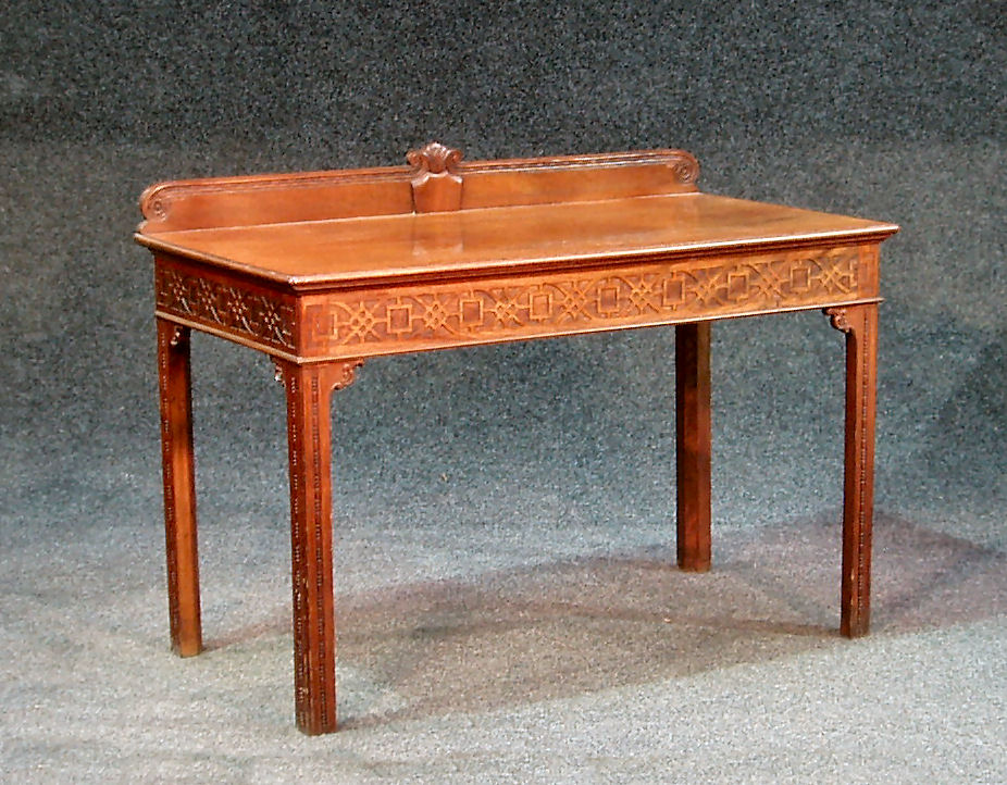 the carved back over moulded rectangular top, closed fretwork panel on beaded square legs