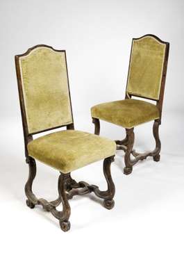 the arched rectangular backs above stuffover seats, on scroll carved front and rear legs united by continuous scroll carved H stretchers, on scroll feet, requiring restoration (3)