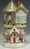 formed as a cottage with floral borders, 18cm high; together with a Staffordshire model of cottage with pillars, 21cm high (2)