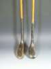 the scared head (distressed) with horn insert to sole, lead counterweight, hickory shaft; and another longnose putter, the scared head (distressed) indistinctly stamped T.L.B. with brass sole plate, lead counterweight, hickory shaft (2)