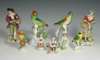 copies of gold anchor period Chelsea, 21cm high; with a similar pair of smaller brightly painted birds; a pair of modern German porcelain figures; and a group of three rustic derby style porcelain figures (9)