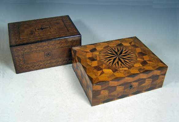A Tunbridgeware games box by Fenner & Co. Tunbridge Wells