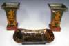 of tapering square section, above gilt paw feet, on a painted marble effect metal base, with classical agricultural motifs and muses, 27cm high; with another toleware dish, with painted scroll decoration, 34cm wide (3)