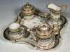comprising a tray; coffee pot; cream jug and stand; sucrier and cover; coffee can and saucer, decorated with bands of pansies and gilt foliate decoration, with painted marks, Rue de Bondy (7)