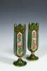 of cylindrical form, with crown shaped head, floral painted and cut glass panels to the body, inswept column, and circular base, with gilt foliate decoration throughout (2)