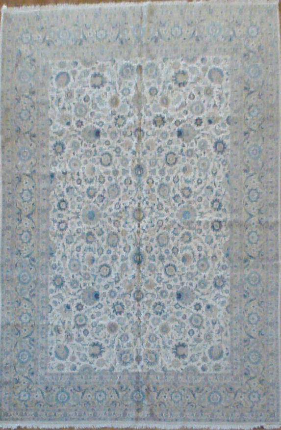 the beige field, with blue palmettes and vines, within a main sand coloured palmette border, between multiple bands