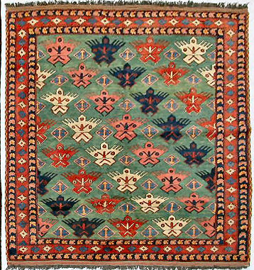 the green field with allover polychrome 'eagle' pattern, within red star border between bands