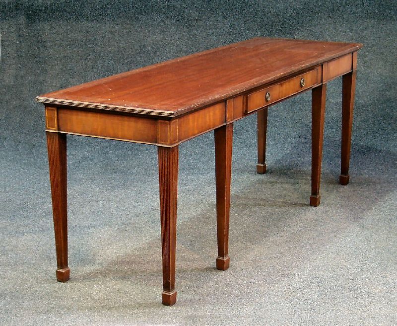 the cross banded moulded rectangular top over a single frieze drawer raised on square tapering reeded legs, spade feet (matching the previous two lots)