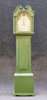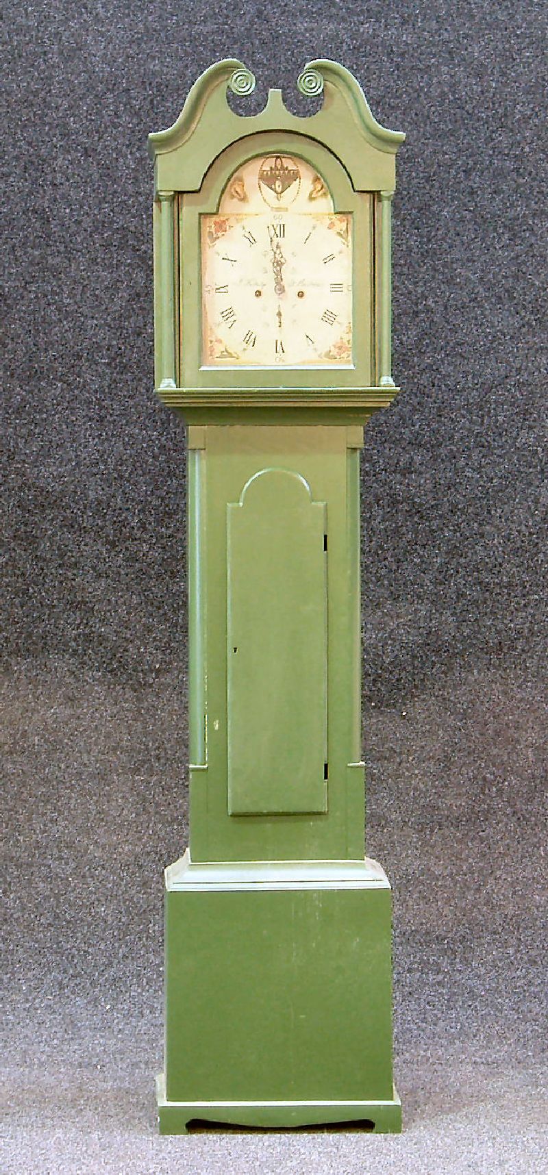 the twin train movement with anchor escapement , the swan neck pediment above enameled dial decorated with flowers, the trunk door with arched crest, plain apron bracket feet