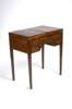the bi-fold top enclosing a ratchet mirror and two lidded compartments above an arched frieze with brushing slides flanked by two short cockbeaded drawers, on square tapering legs