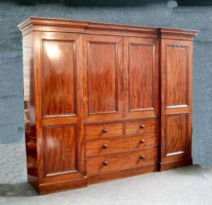 the projected moulded cornice over panelled doors three graduated long drawers on plinth base