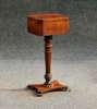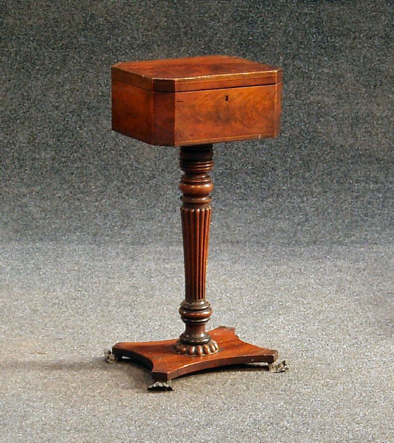the boxwood strung lid with canted corners, enclosing six wells raised on tapering readed baluster column, quadruped base, brass lion paws