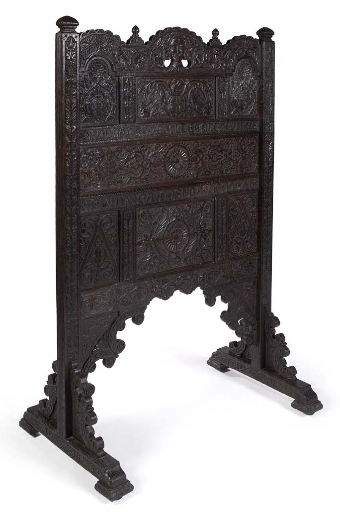 possibly mid 17th century, derived from a rood screen or bed panel, on later adapted cheval-type stand, the arcaded top rail with a central mask of a moustachioed gentleman above two transoms inscribed 'Robert Greville Catherine/ 'Vix Ea Nostra Voco 1648' flanked by subsidiary wainscot panels depicting Greville family armorials, roundels and strap work, the verso similarly carved and inscribed (some carving possibly of a later date for the purposes of adaptation), the stiff leaf carved uprights on trestle bases with scroll carved angle brackets