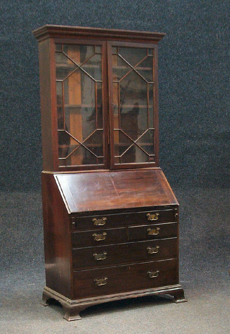 the projected dentil cornice over two astragal glazed doors enclosing shelves, moulded fall-flap enclosing fitted interior,a single frieze drawer, two short over two graduated long drawers, raised on ogee feet
