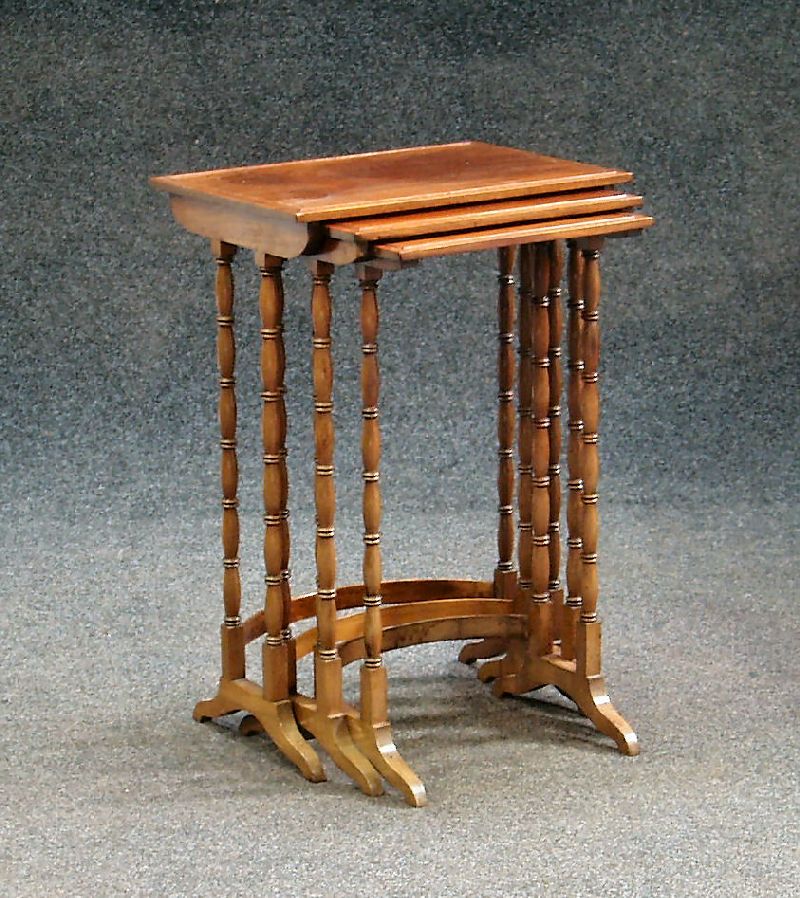 each with moulded rectangular top raised on bobbin turned legs down swepted feet, united by a single concaved stretcher (3)