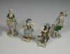 in the Meissen style, of a man and a woman, with polychrome floral decorated outfits, with lamb, on a gilt base, marked to base, 21cm high; with another pair of continental porcelain figures, of a man and a woman with drinking vessels, with blue and gilt decoration,16cm high