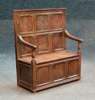 the rectangular back with rosette and lozenge carved panels above downswept arms and hinged box seat, on stem feet