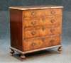 the quarter-veneered top with moulded edge above two short and three graduated long drawers with engraved brass handles and escutcheons, the skirted apron raised on boldly turned bun feet