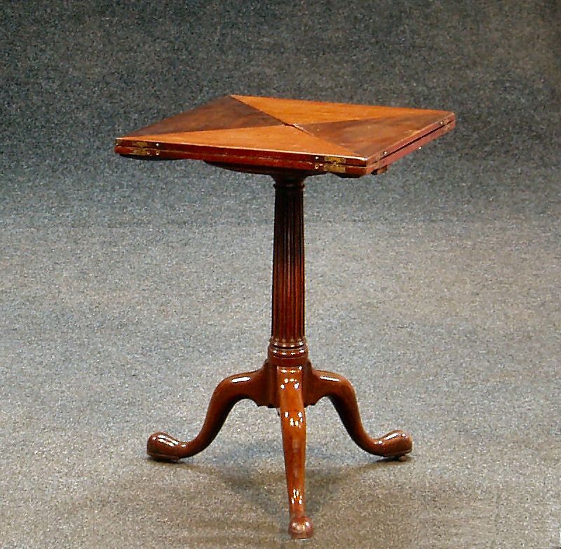 the top with four quartered leaves on pivotting rests, on a fluted tapering column and cabriole tripod base with pad feet and recessed miniature brass and leather castors, the top possibly later adapted