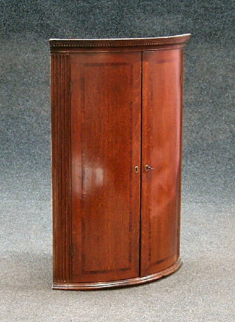 the projected dentil cornice, over two cross banded doors enclosing shelves, flanked by fluted columns, plinth base