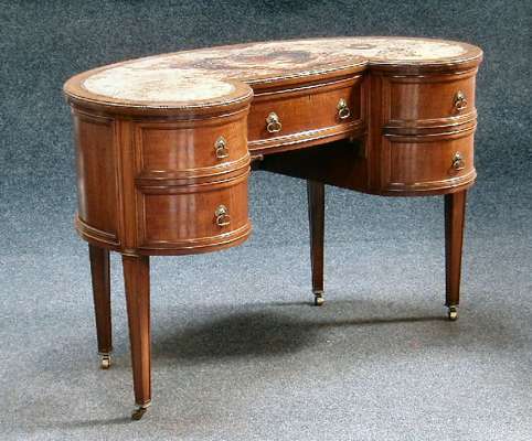 the bead and real top with skiver over a single frieze drawer flanked by two drawers raised on square tapering legs, brass castors