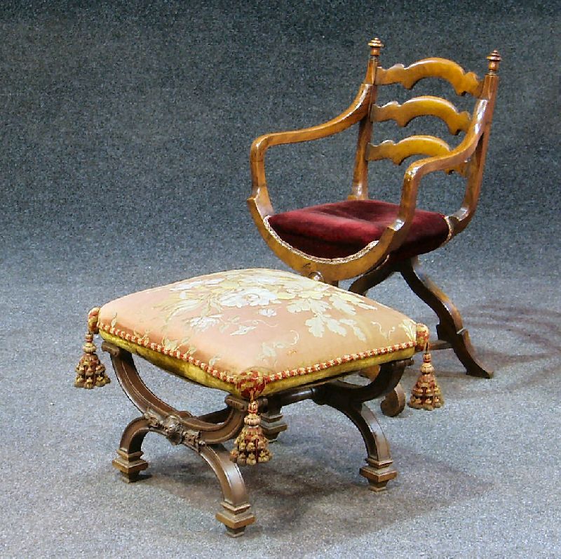 with serpentine ladder back topped with urn finials over cushioned seat X-frame stretcher; including a walnut cushioned X-frame stool (2)