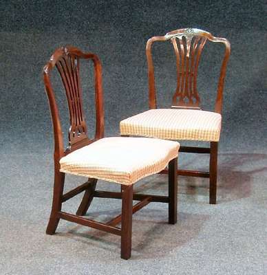 each with serpentine top-rail fleur-de-lis over vertical splats, serpentine cushioned seats, square legs united by stretchers, (3)