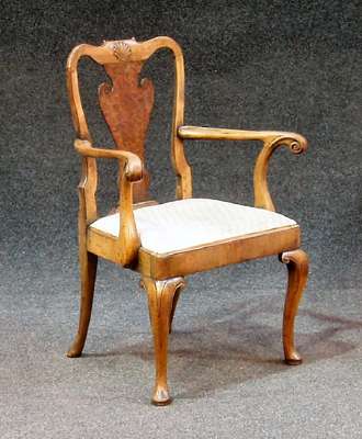 the shaped top-rail with carved fleur-de-lis over a vertical fiddle back splat out stretched arm terminating in C-scrolls, drop-in cushioned seat, cabriole legs, pad feet
