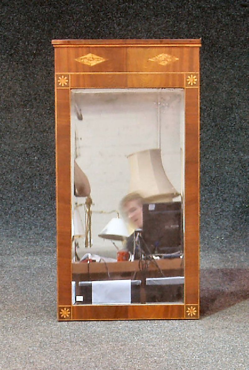with projected cornice over a inlaid frieze panel and cross banded frame